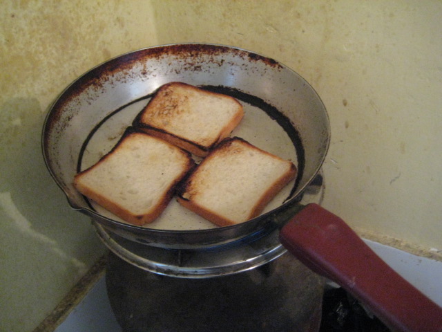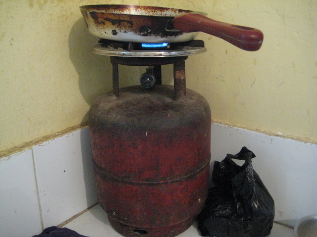 コンロがまた渋いんよ!これ↓オーブンレンジもないからフライパンでパンを焼く。